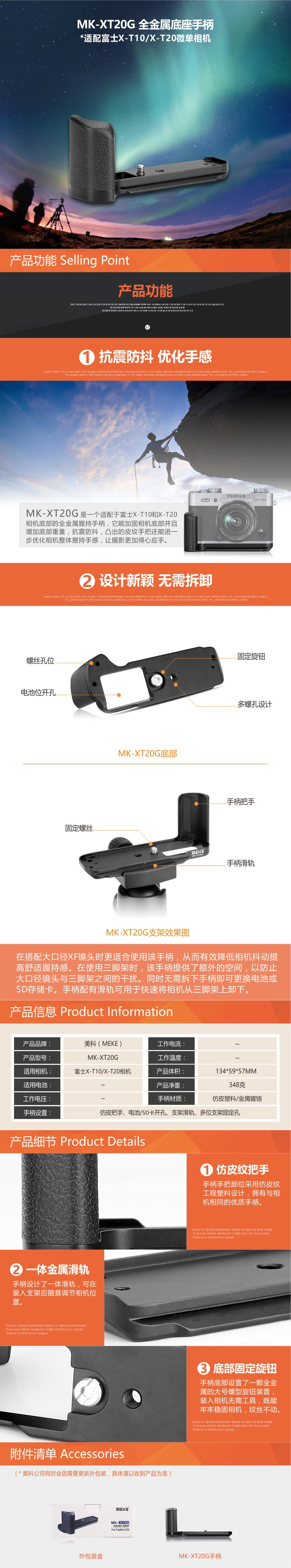 ◆ MK-XT20G是一個適用于富士X-T10和X-T20相機底部的全金屬底座手柄,它由一整塊金屬制作,能有效抗震防抖,增加相機的握持手感。