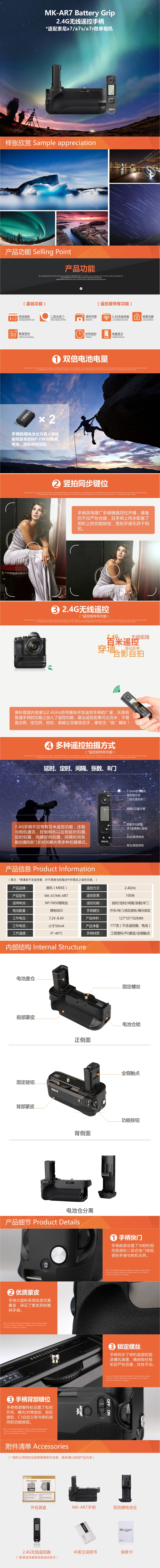 ◆ MK-AR7除了擁有一般手柄的豎拍功能和雙倍電池續(xù)航外,還可以使用2.4G無線快門遙控器進(jìn)行遙控拍攝,定時(shí)遙控器可設(shè)置延時(shí)時(shí)間、曝光時(shí)間、照片間隔時(shí)間以及拍攝張數(shù)。內(nèi)置2.4G模塊,遙控距離可達(dá)百米以上,且無方位限制。在拍攝星空、星軌、風(fēng)光、人像等多種場合拍攝創(chuàng)作時(shí)非常方便。